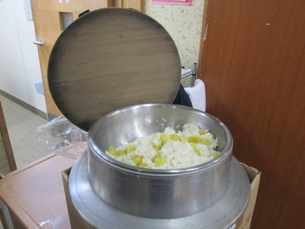 新米のコシヒカリと皆さんで作ったさつま芋を合わせて、さつま芋ご飯でいただきました。