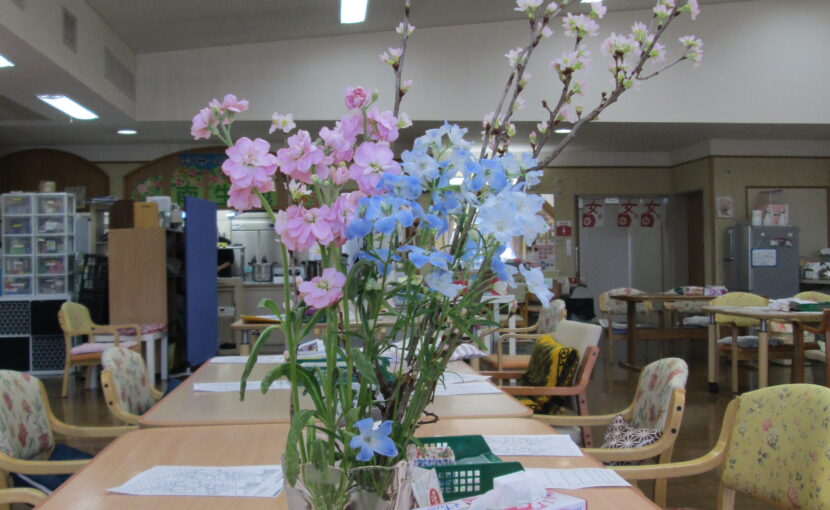 フロアに飾ると、利用者様から「きれいだね」「もう春が来たみたい」と笑顔と会話が広がりました。